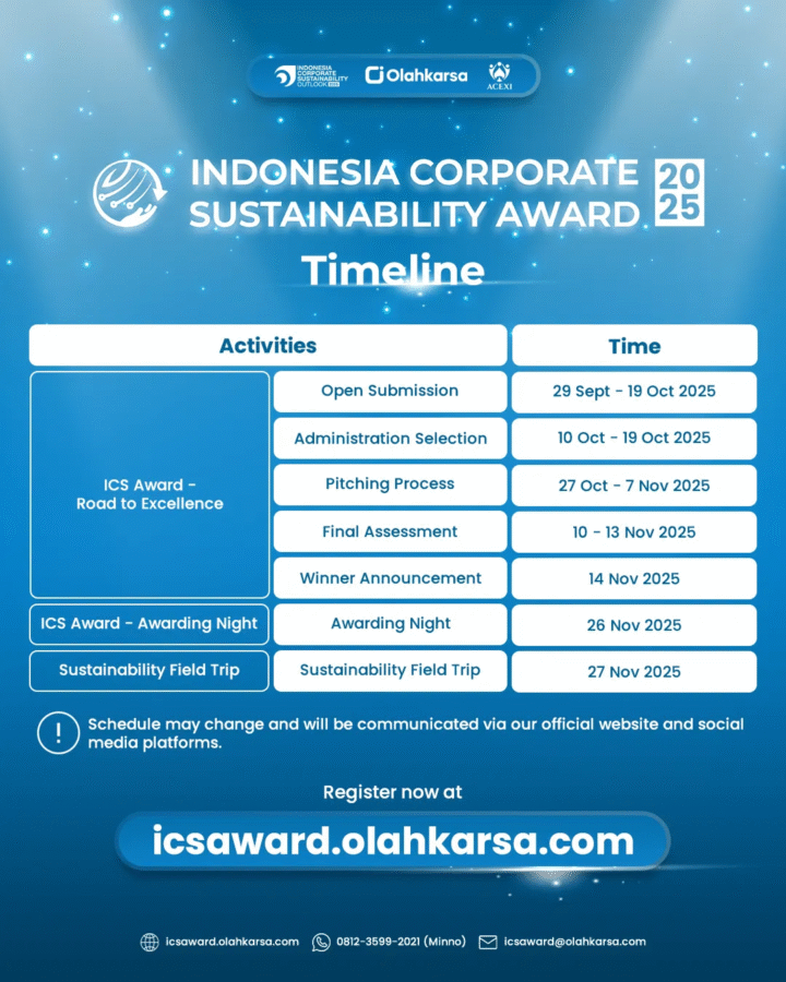 Sebagai informasi, ICS Award 2025 sepenuhnya GRATIS. Tidak ada biaya registrasi maupun partisipasi. Jadi, waspadai segala bentuk pungutan yang mengatasnamakan Indonesia Corporate Sustainability Award (ICSA), Olahkarsa, ataupun ACEXI.